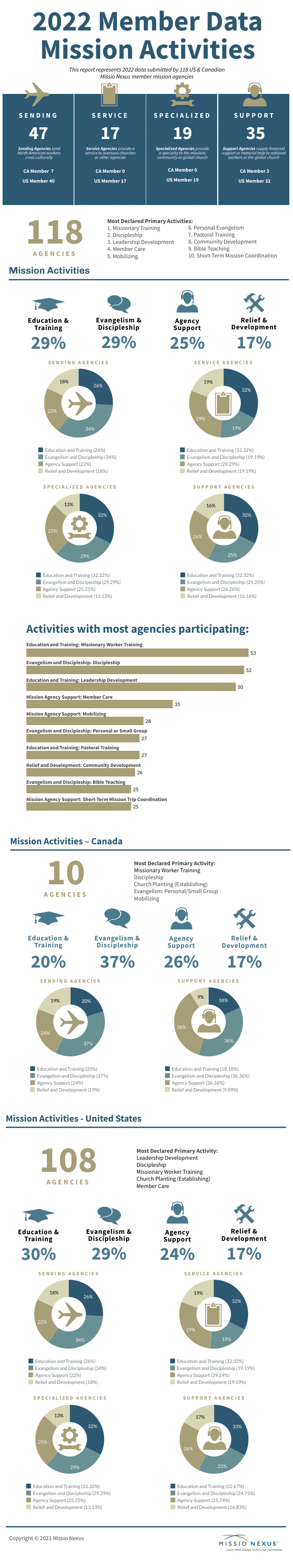 The 2022 data does not reflect much of a change from the 2021 data as far as the percentage of mission activities spread across the four main categories of Education and Training, Evangelism and Discipleship, Agency Support, and Relief and Development. We have seen a trend over the last few years of data collection of the primary activities shifting away from Evangelism and Discipleship to other support, service, and specialized arenas. There has been a shift in the role of the North American mission enterprise in focus and activities.