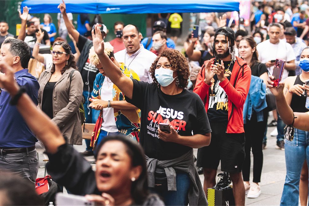 New York City: City residents join in worship during a concern on Times Square as part of the Jesus Week Movement. The movement has mobilized thousands of churches to work together to saturate New York City with the gospel. Photo courtesy of Urban Hope.