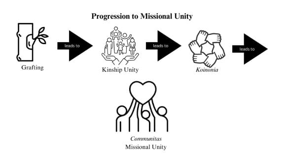 Grafting various groups together leads to kinship unity in Christ, which leads to koinonia, which leads to fulfilling the mission of God as modeled by the Triune God. The Church demonstrates the fulfillment of the mission of God through missional unity or communitas (see figure 11.1).