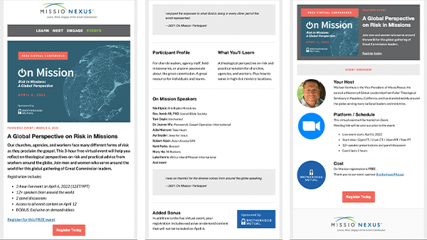 On Mission is a virtual conference to engage the broad missions community in shared learning for the communication of new innovative ideas that will lead to collaborative action for the sake of the Great Commission. It is produced by Missio Nexus and provided free of charge in partnership with Brotherhood Mutual Insurance Company.