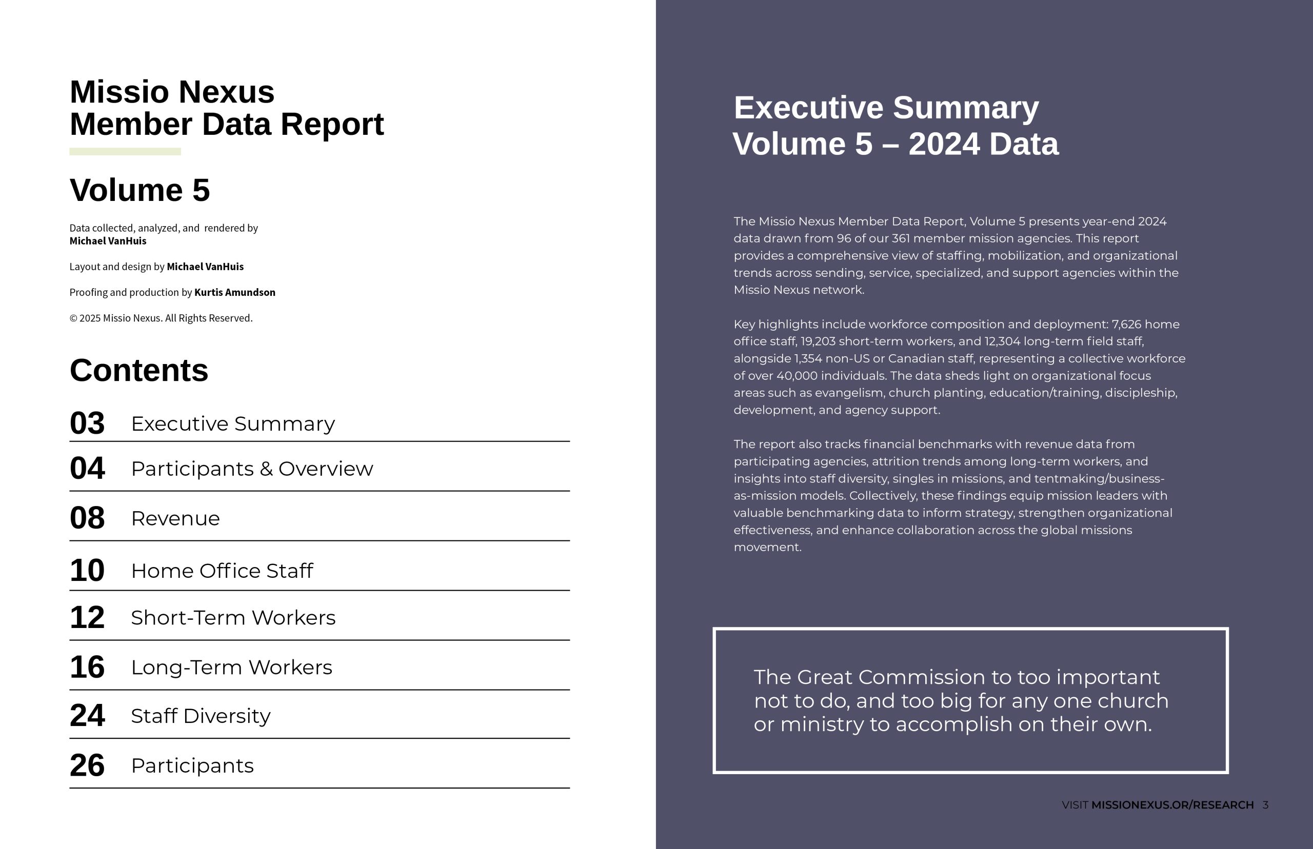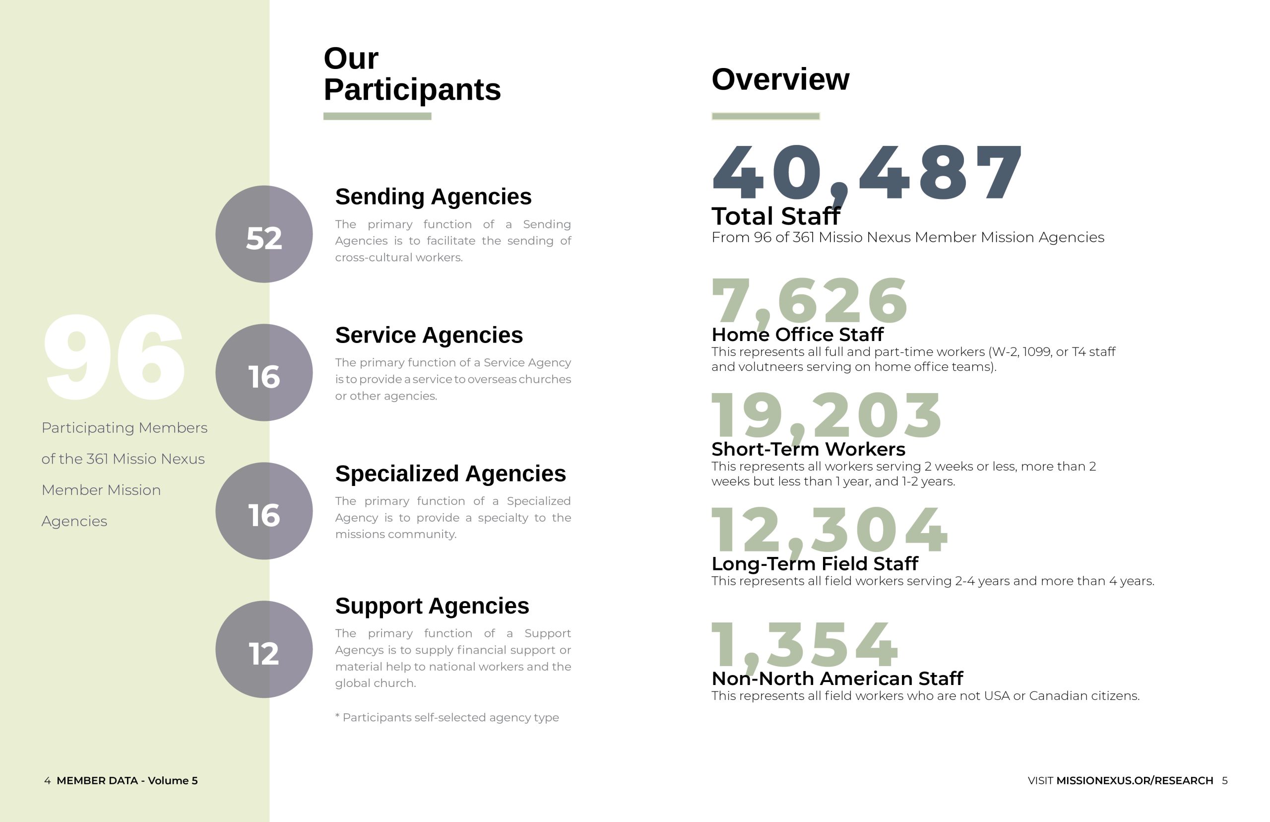 The Missio Nexus Member Data Report, Volume 5 presents year-end 2024 data from 96 of 361 Missio Nexus member agencies—representing more than 40,000 staff serving around the world. This exclusive resource offers insights into workforce composition, short- and long-term mobilization, financial benchmarks, staff diversity, and more.