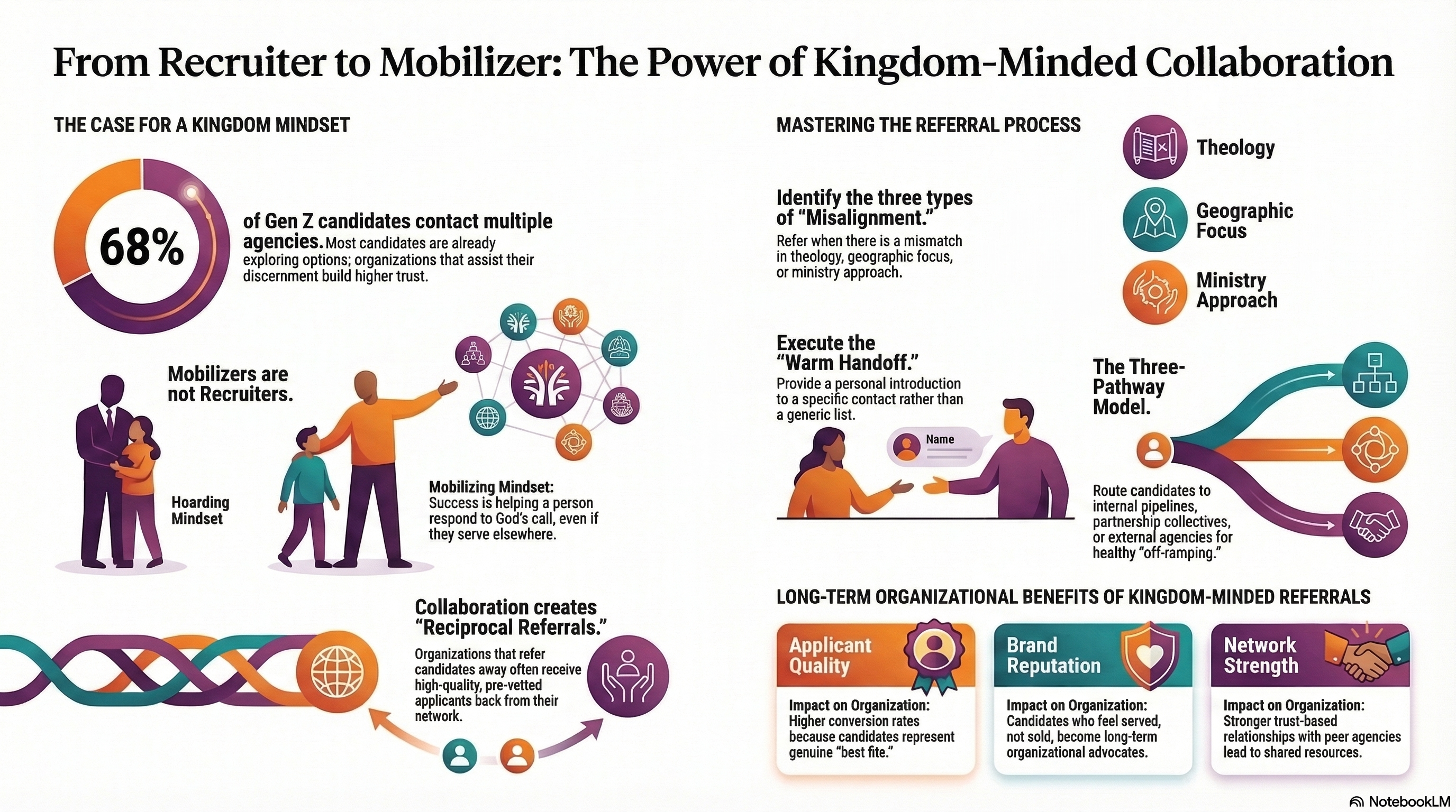 Research highlights that this collaborative posture is essential for engaging Gen Z candidates, 68% of whom contact multiple organizations during their discernment process. While seemingly self-sacrificial, practicing gracious and specific referrals builds organizational credibility, generates reciprocal referrals from peer agencies, and results in higher-quality applicants who are a genuine fit for the mission.