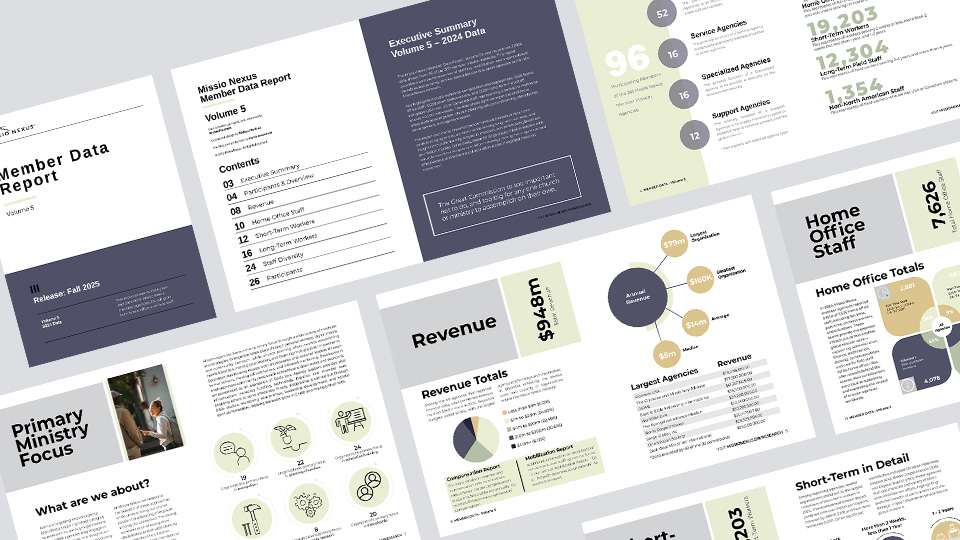 The Missio Nexus Member Data Report, Volume 5 delivers year-end 2024 insights from 96 of 361 member agencies—representing more than 40,000 staff serving globally. This Missio Nexus member-exclusive resource provides a clear picture of workforce composition, mobilization trends, financial benchmarks, diversity, and more.